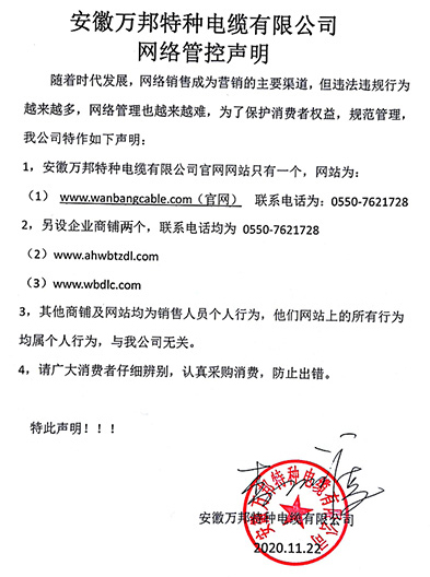 鄭重聲明:安徽萬邦特種電纜有限公司官方網站為:www_wanbangcable_com.dajilin.cn,除此之外無任何子網站或合作網站,其余均為假冒偽劣。電話:0550-7621728 13485756353 地 址:安徽省天長市滁州高新技術產業開發區經四路29號